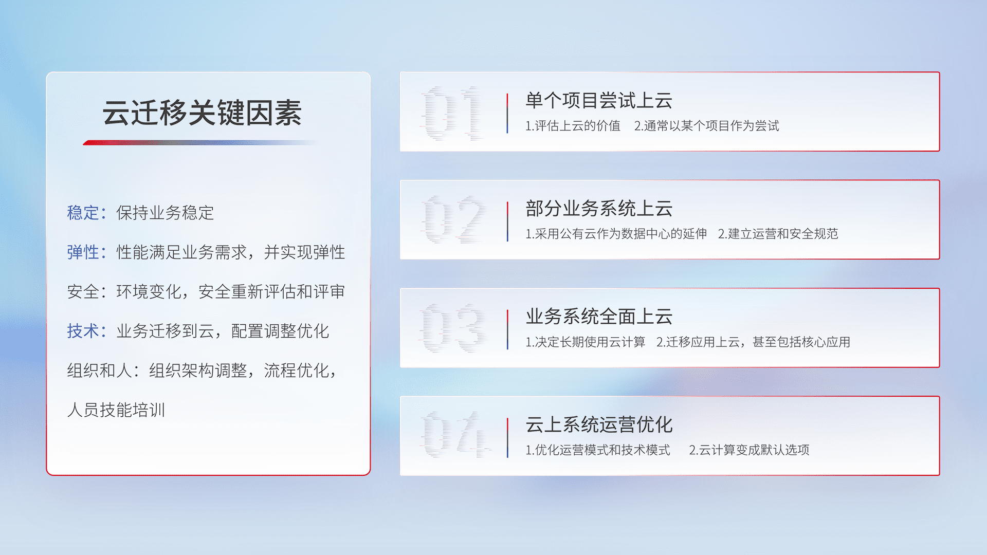 结合实际业务,,,从规划设计、、、云平台选型、、云原生改造、、数据迁移、、、集成交付,,迁移全过程为客户识别最佳上云路径,,做好风险识别管理,,,设计网络架构、、、身份权限、、、、安全审计合规、、、、操作审计、、、日志审计、、、监控告警策略、、多站点容灾设计等,,,,对云上基础设施进行整体规划,,,,提升IT治理水平,,,,以满足弹性、、、、高可用、、、、高性能的需求。。