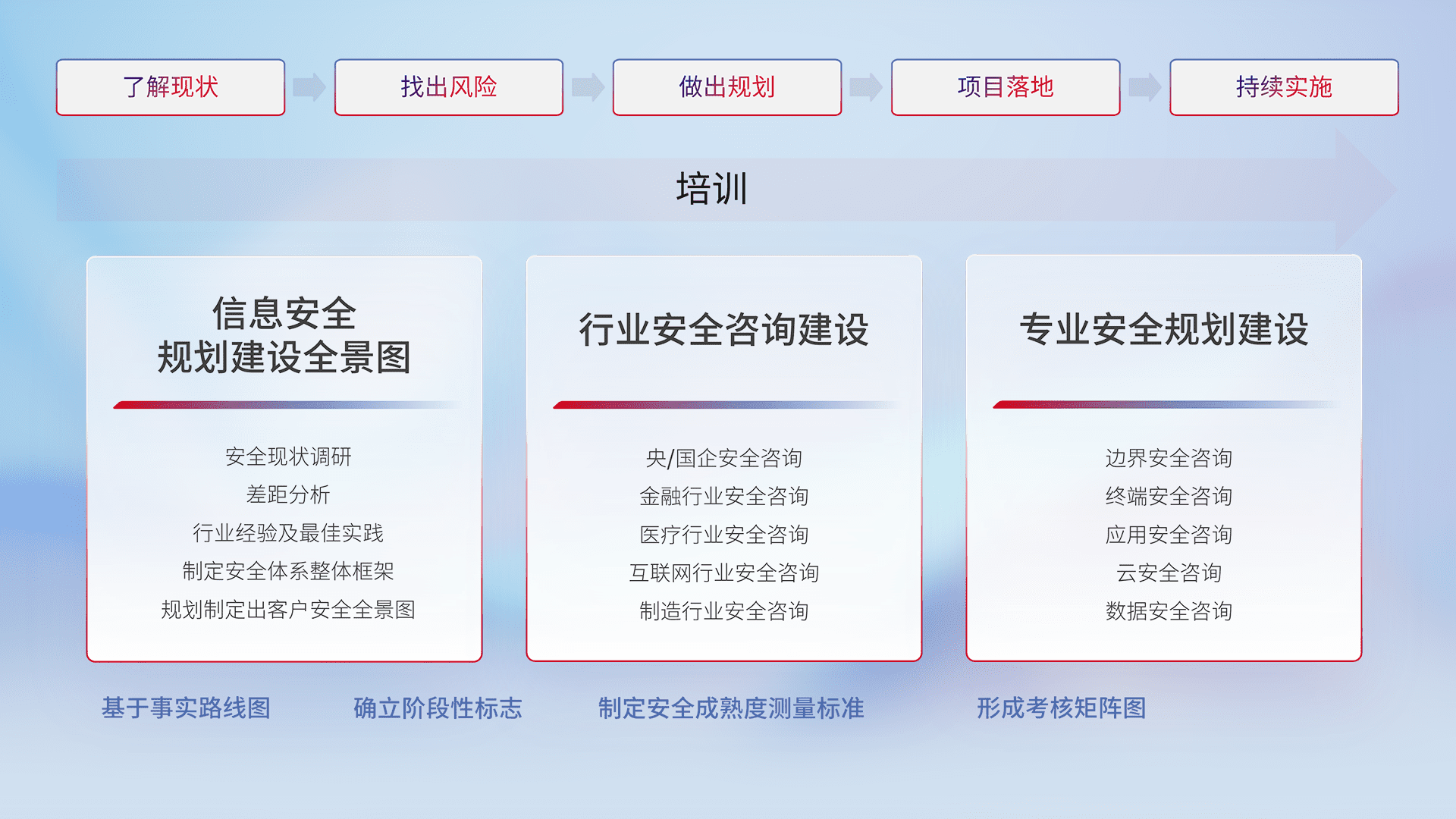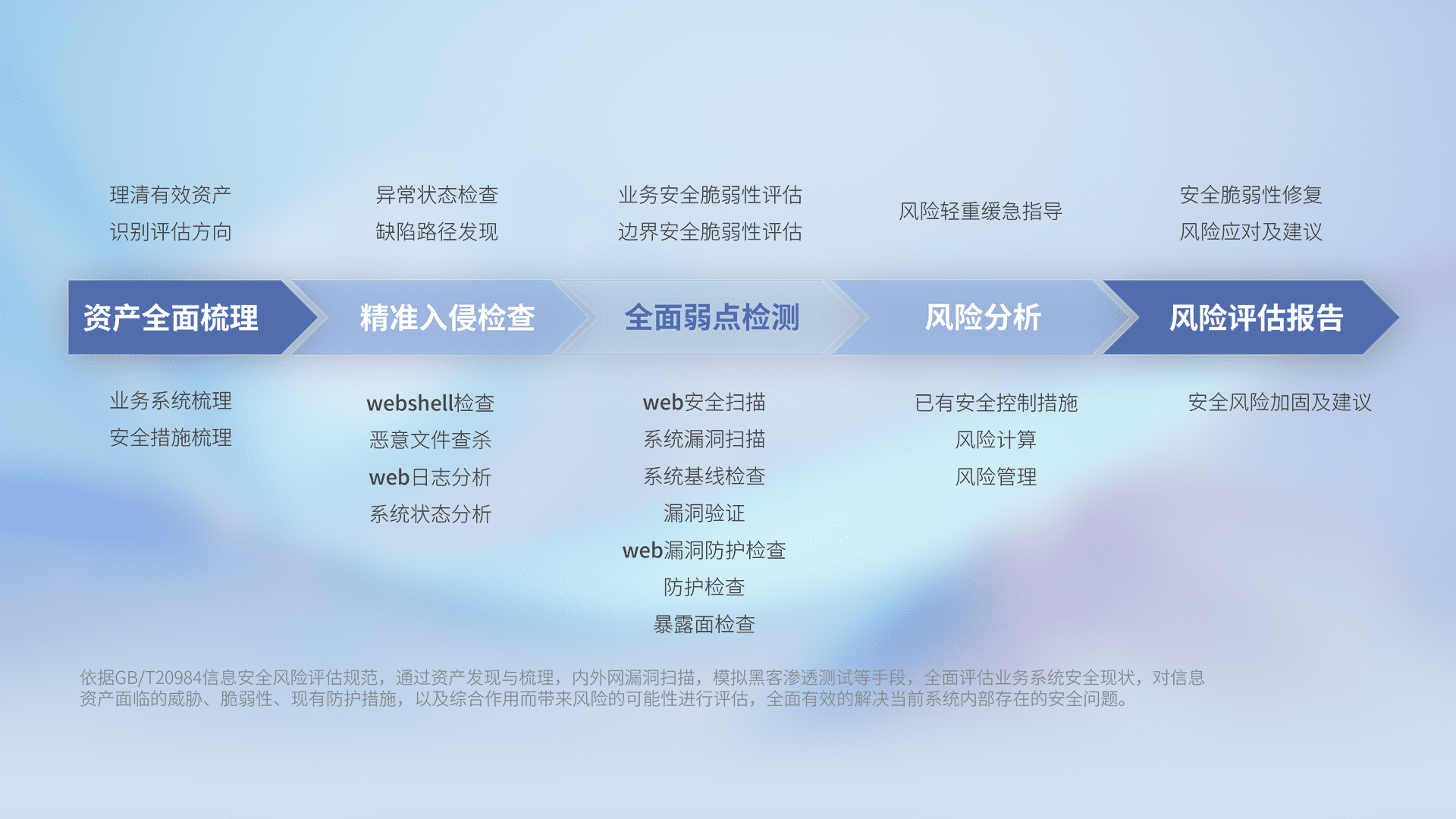 针对客户行业特性,,,以专业的安全服务+多厂商联合解决方案提供专属的一站式安全管理服务,,,帮助客户全面感知网络空间威胁,,,基于识别、、检测、、、、分析、、防护、、监测、、响应的服务理论模型,,,,从方案咨询、、、、集成交付、、评估验证、、优化加固、、、、运维运营,,,致力于为客户提供完整的闭环管理式安全服务。。。以实战经验为客户打造高抵御风险的安全体系,,帮助客户发现威胁、、、、对抗威胁、、、、处置威胁,,,不断积累安全对抗能力,,,,持续保障数字化安全。。。。